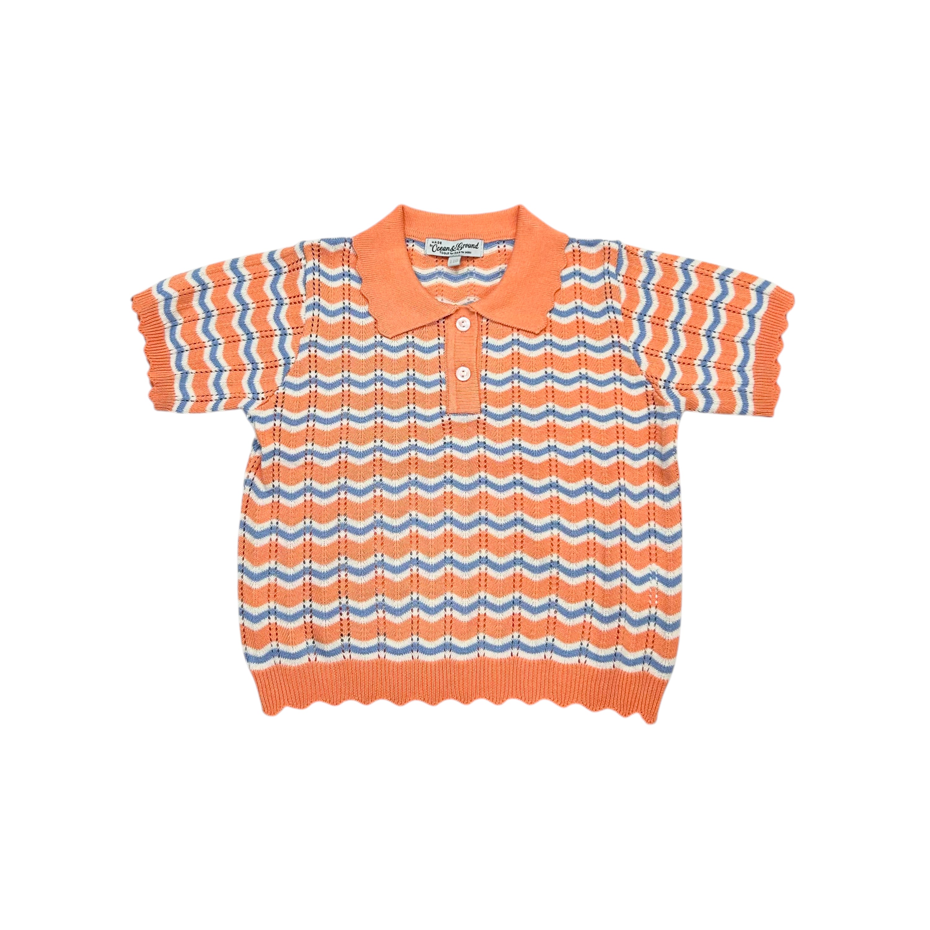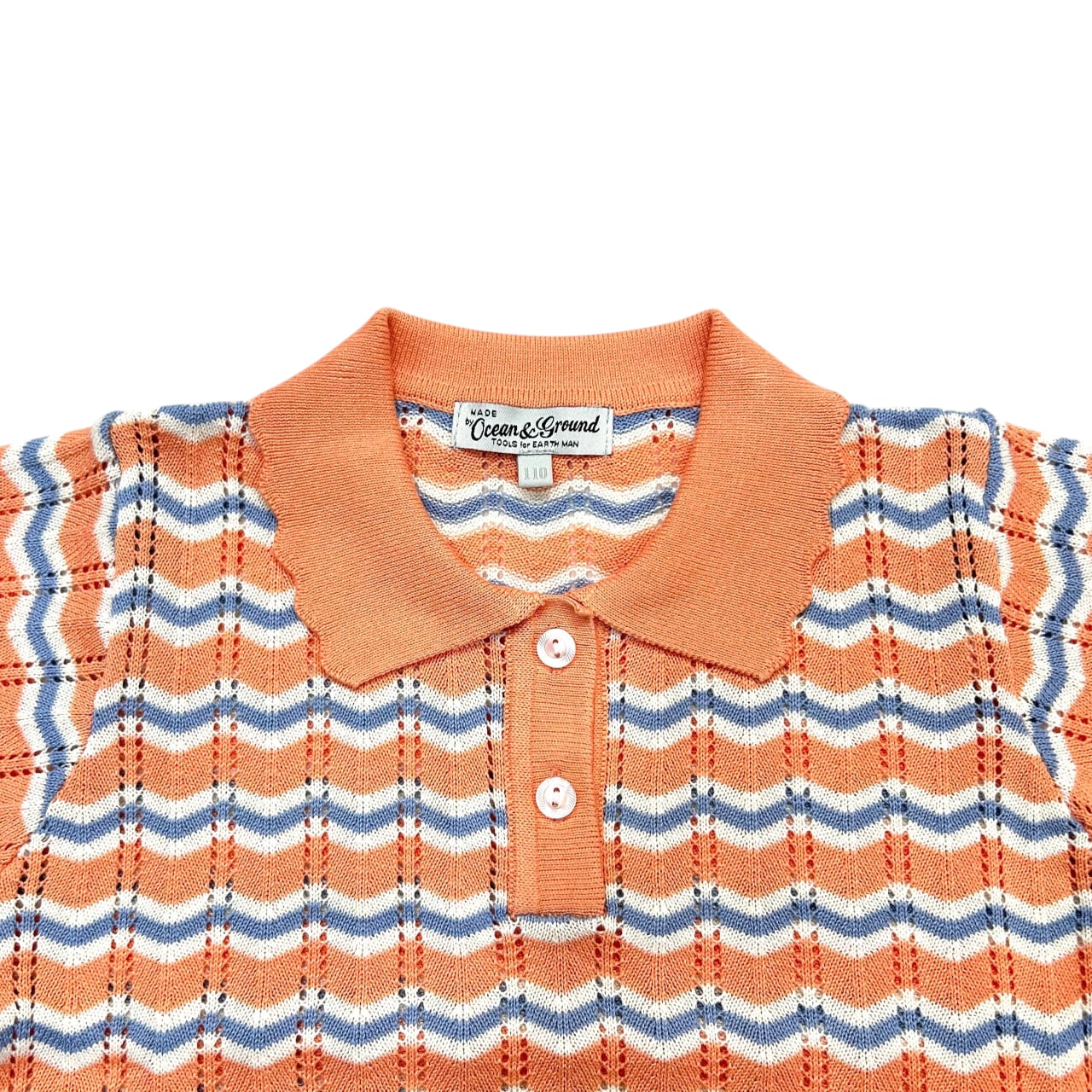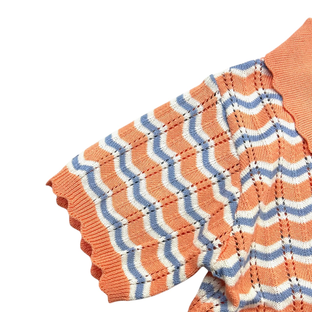レトロなカラーリングが可愛い、透かし編みの衿付きニット