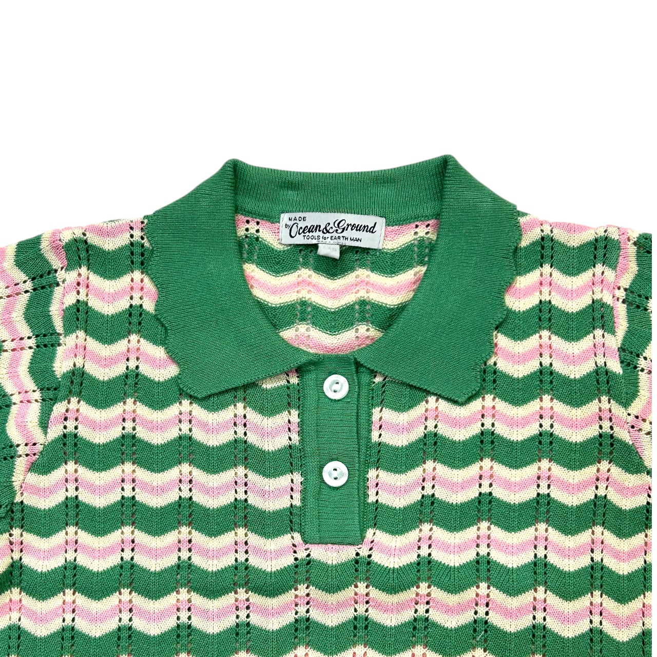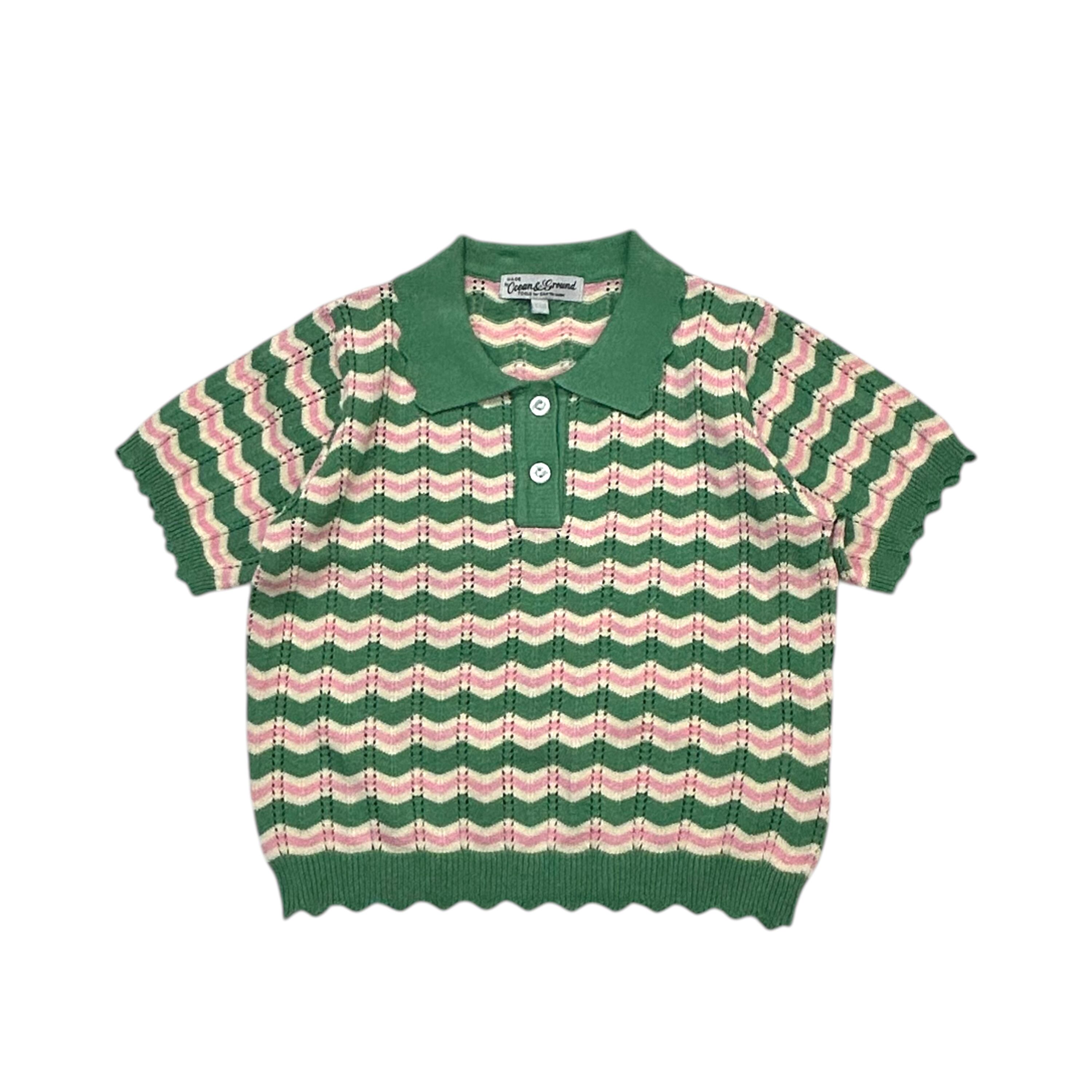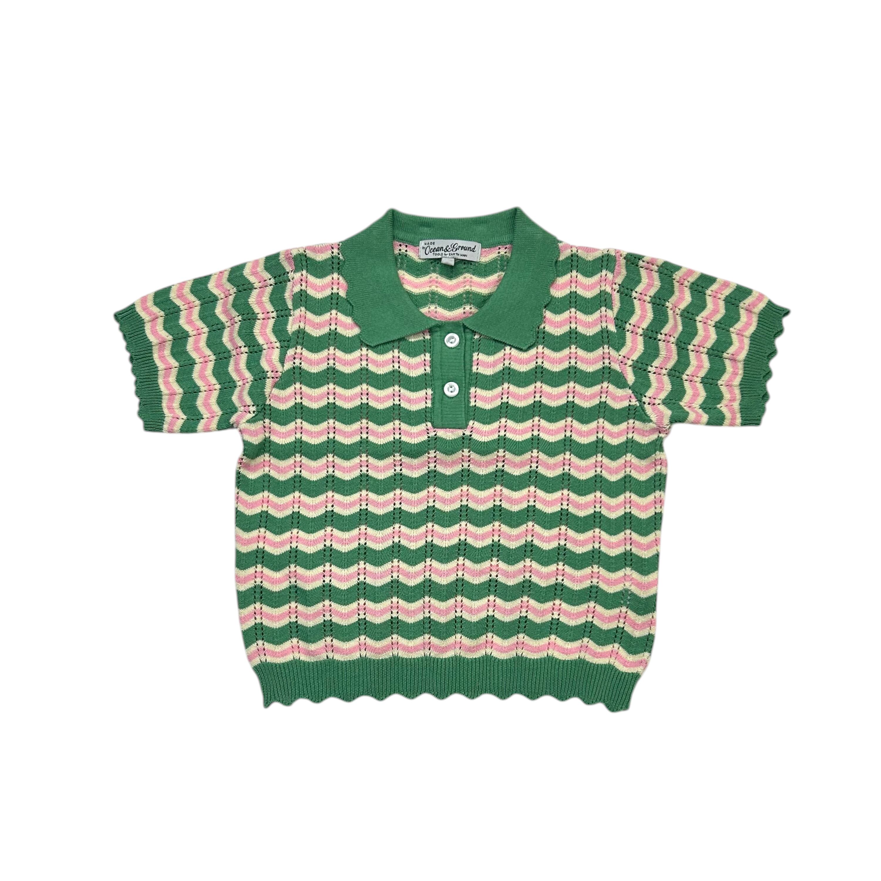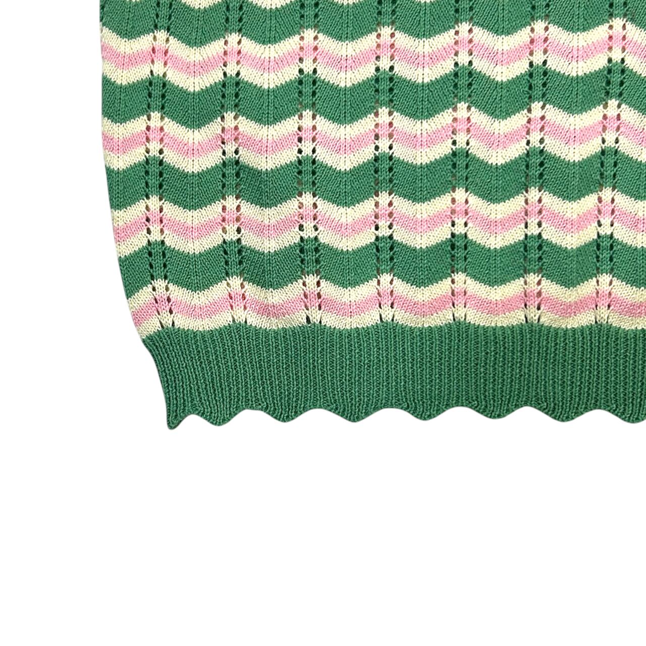 レトロなカラーリングが可愛い、透かし編みの衿付きニット