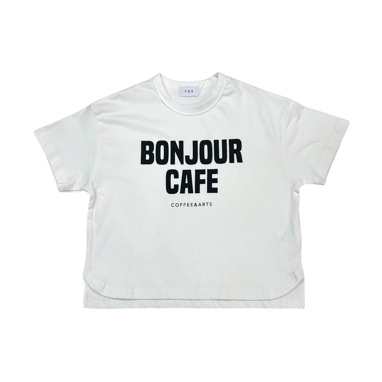 フロントはラウンド、バックはボックスになったロゴTシャツ