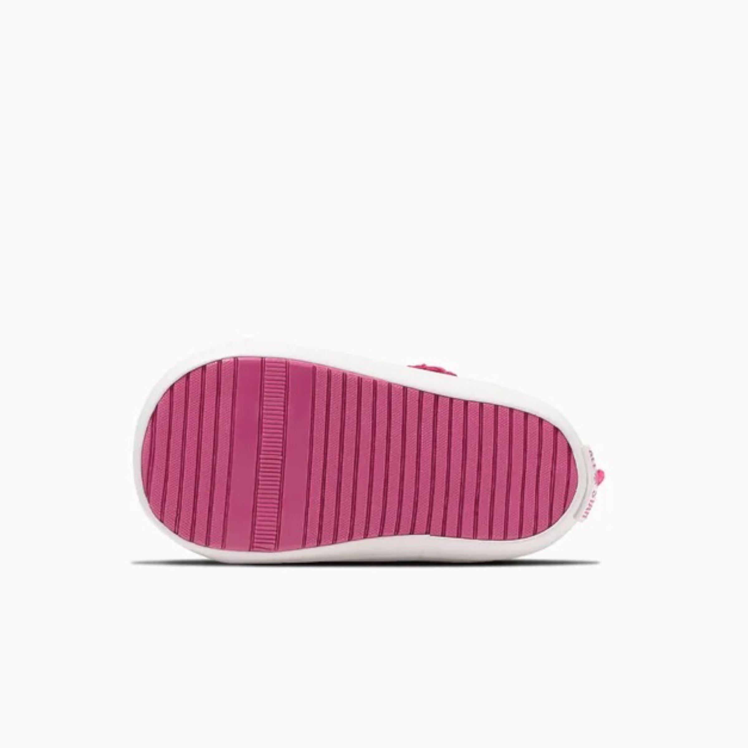 恐竜の特徴的な骨板を踵にギザギザで表現し、ベルト部分は爪を付けて前足を表現。インソールには恐竜の卵が隠れているのもポイント。また、ベルトタイプと踵ループの採用により、履かせやすさも実現しています。