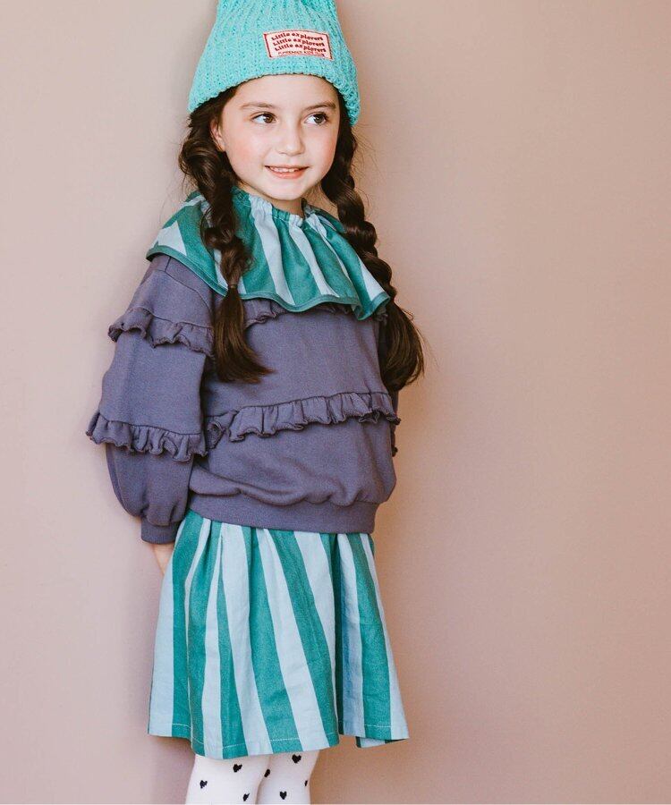 パイピングや袖のデザインがポイントになっていて、1枚でももちろん可愛いですが、薄手なので、セーターやトレーナー、レギンスなどをあわせてコーディネートして、重ね着スタイルも楽しめます