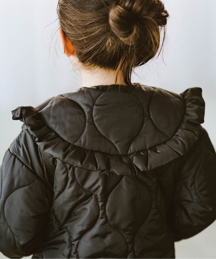 チャコールの「たくさんリボンのプルオーバー」やピンクの「ふわふわチュールスカート」に合わせて羽織ると、とても可愛らしい組み合わせに。